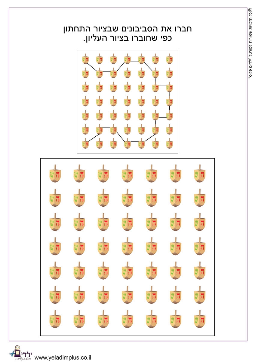 דף עבודה לחג חנוכה- מחברים בין הסביבונים בעזרת קו לפי הדגם הנתון.
