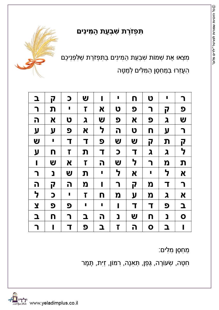 ארצנו התברכה בשבעת המינים- חיטה, שעורה, גפן, רימון, תאנה, תמר וזית. לפניכם תפזורת נחמדה, שבה צריכים לאתר הילדים את שבעת המינים. הדפיסו להנאתכם!