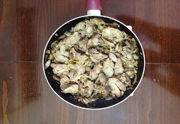 - מבשלים את כבדי העוף במשך דקה וחצי, הופכים אותם ומבשלים עם מכסה למשך דקה-שתיים נוספות.