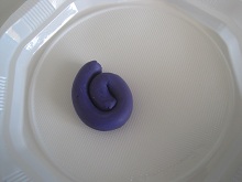 שלב 1 יוצרים גליל ארוך מפלסטלינה סגולה ומגלגלים אותו לצורת קונכיה. | ![]() |
