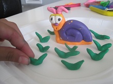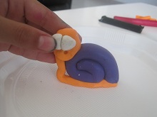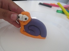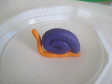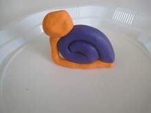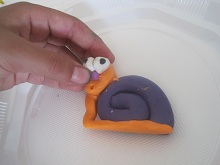 שלב 4 יוצרים את ראש השבלול ככדור מפלסטלינה כתומה ומצמידים אותו לגוף השבלול ולקונכיה. | ![]() |