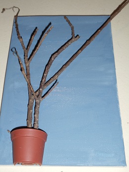 שלב 2 חוצים את בית העציץ ל 2, מדביקים את חציו בתחתית המשטח בעזרת דבק חם, ומדביקים את הענף למשטח כשהחלק התחתון נכנס אל תוך בית העציץ. | ![]() |